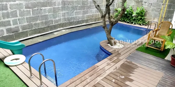 Tak hanya itu, yang menarik dari desain kolam renang 7×3 milik Bapak Wisudawan ini adalah terdapat sebuah pohon yang sengaja ditanam di area kolam renang.